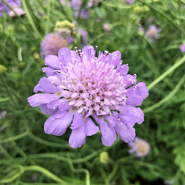 This is called a Pincushion Flower - Scabiosa columbaria - 'Butterfly Blue'.