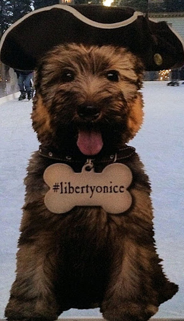 Liberty Dog - a cardboard cutout - was welcoming skaters to the ice-skating rink in the middle of the town (it was in the winter when we visited).