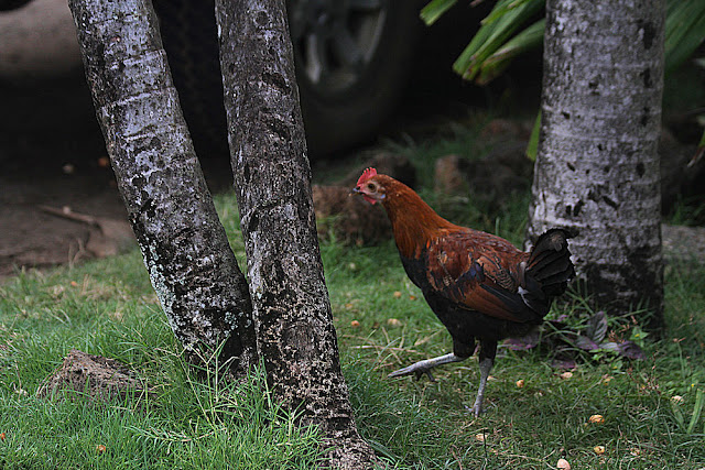 One of the things I love about Hawaii is that you will find chickens everywhere. In the city, in the countryside. They don't belong to anyone in particular and are considered wild chickens. My sister-in-law told me that if they roam on your property they can be considered yours.