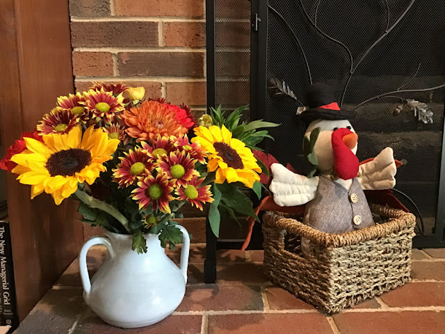 Following on from my post yesterday, I am sharing the flowers my Dear Other Half brought home. It had all my favorite Autumn colors. You will also see my Thanksgiving Turkey (also a little early) and the Pilgrim birds again. The cute basket Mr. Thomas Turkey is sitting in is part of one of the gifts from my son and daughter-in-law from last Christmas. It stays out all year round.